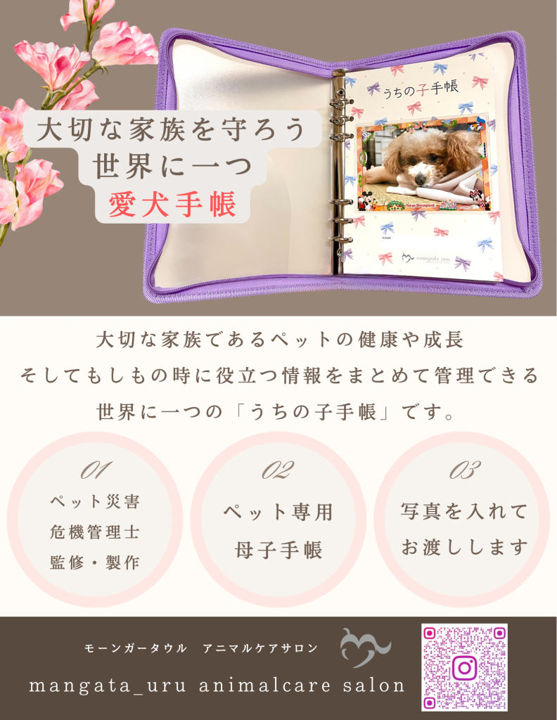 ペット災害危機管理士が監修・製作した、 大切な家族を守るための「うちの子専用 防災手帳」です。